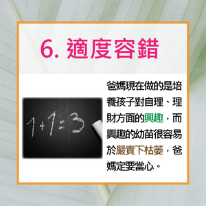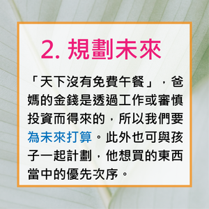 理財態度 從小開始陳嘉輝2020年10月7日讀畢需時 1 分鐘已更新:2020年10月10日全球經濟不景,很多父母都擔心個人及家庭的財政。有些朋友更感慨如果自己早一點學懂理財就好了。 的確理財態度及觀念應從小開始培養,尤其關於理財方面的知識,學校暫未有包含,即使個別有提及也多是「點到即止」。所以父母向孩子灌輸正確的理財態度及觀念是責無旁貸。 8個由淺入深的基本態度及觀念,理財從家教開始 [以上內容為作者之個人意見及立場]